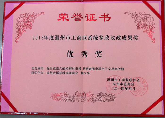 最近,温州市工商联下发文件表彰2013年度全市工商联系统参政议政优秀成果奖作者,我会会长杨立忠《提升改造六虹钢材市场,筹建鹿城金属电子交易商务楼》一文入选优秀奖。此次评选是全市工商联系统根据2013年度参政议政的调研报告、建议、提案为基础进行评选。