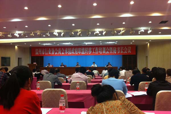 10月31日下午,市工商联召开温州市行业协会商会承接政府职能转移工作培训会暨秘书长会议,温州各县(市)区工商联、市属行业协会商会代表与会,我会秘书长参加会议。