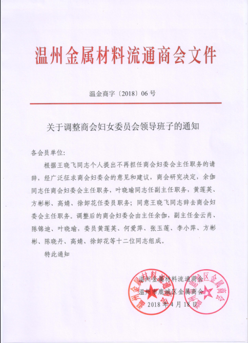 关于调整商会妇女委员会领导班子的通知