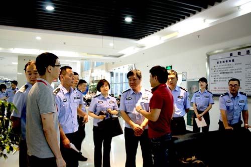 7月11日上午,山东省滨州市公安局交警支队车管所所长吕长利一行8人在市车管所教导员洪亮等领导的陪同下,考察了市政协杨立忠委员工作室驻市车管所工作站,杨立忠委员工作室成员杨立忠、林潔、金枫、徐智潜等热情接待吕长利一行,双方开展工作交流。