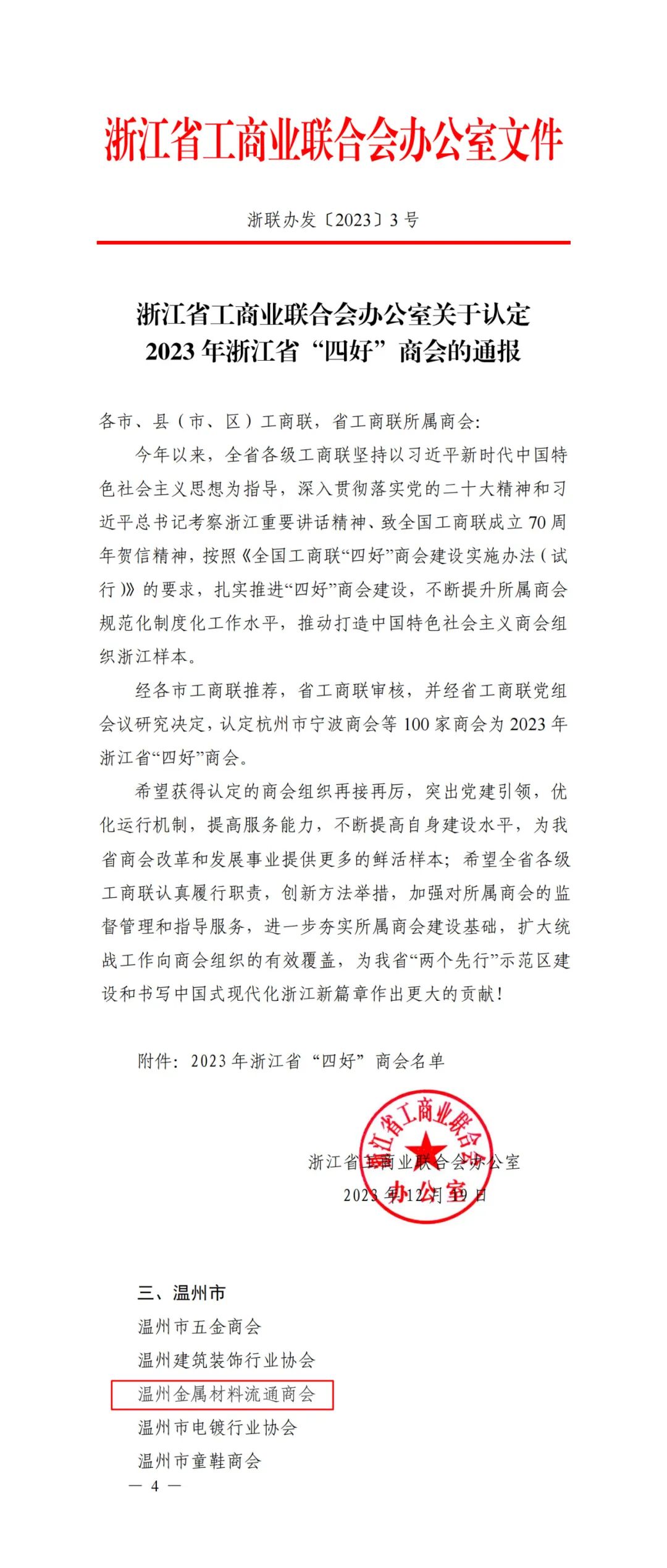 近日,经各市工商联推荐,省工商联审核,并经省工商联党组会议研究决定,认定温州金属材料流通商会为2023年浙江省“四好”商会。
