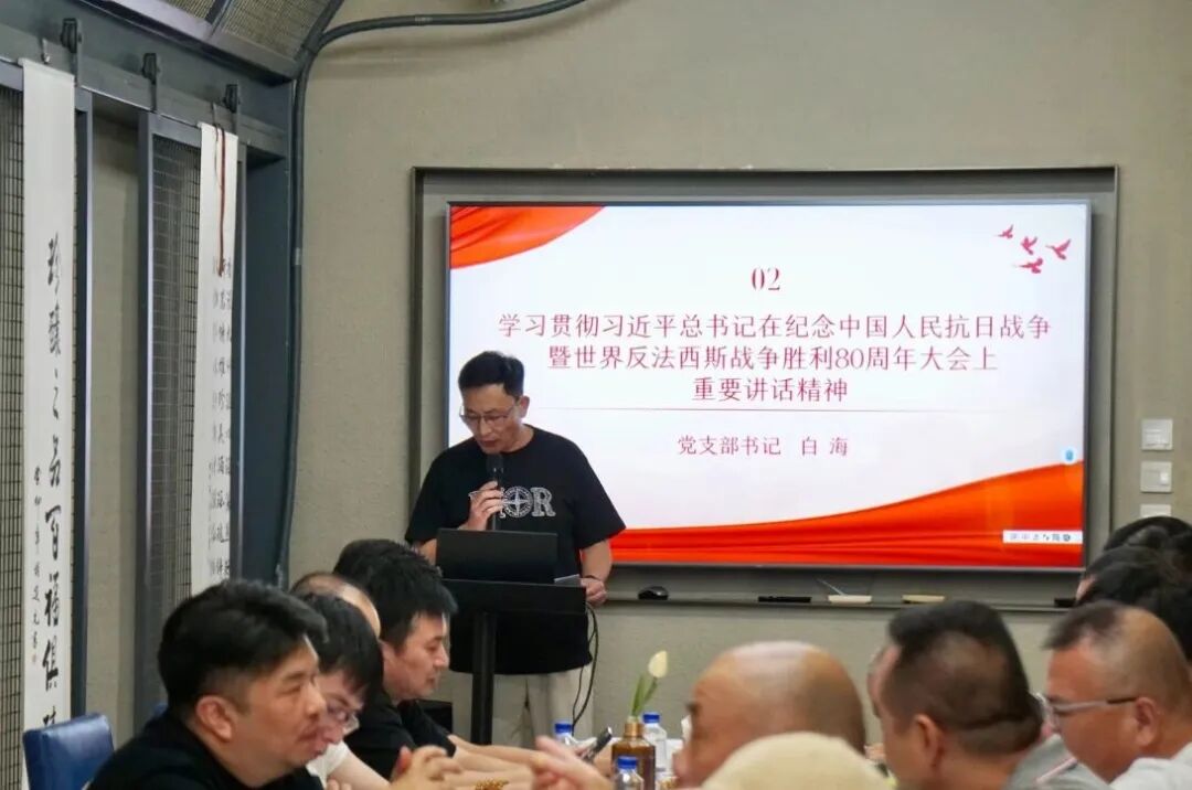 随后,商会党支部书记白海带领与会人员学习习近平总书记在纪念中国人民抗日战争暨世界反法西斯战争胜利80周年大会上的重要讲话精神。白海强调,习近平总书记提出的伟大抗战精神,即天下兴亡、匹夫有责的爱国情怀,视死如归、宁死不屈的民族气节,是激励商会和会员企业奋发图强的强大精神动力。商会将继续传承和弘扬抗战精神,把爱国情怀转化为推动企业发展和社会贡献的实际行动。