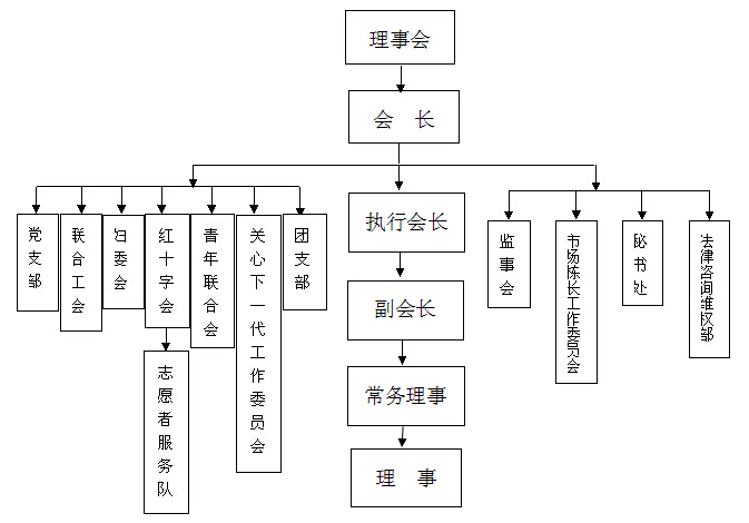 温州金属材料流通商会,温州市鹿城区金属商会内部组织机构齐全,分设:党支部、联合工会、妇委会、青联、红十字会、志愿者服务队、青年联合会、关心下一代委员会、团支部。商会秘书处为常设机构,同时,为充分发挥和监督理事会作用,又成立了监事会、市场栋长工作委员会、法律咨询维权部。
